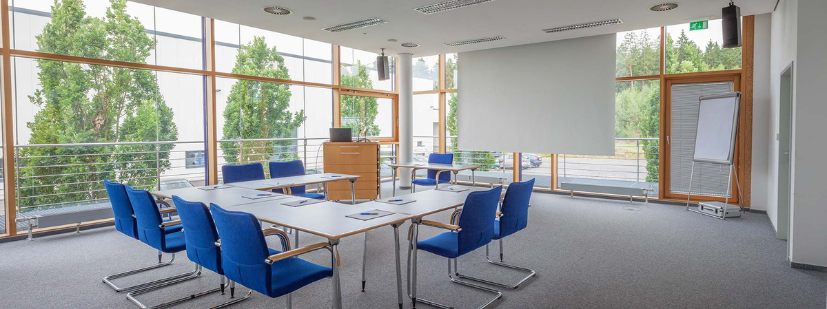 Der klimatisierte Konferenz- und Seminarbereich befindet sich im Obergeschoss des Hauptgebäudes, erreichbar über eine großzügige Treppe im Empfangsbereich oder den Fahrstuhl im Mietbereich. Die Räume spiegeln die moderne Architektur unseres Gebäudes wider. Große Glasfronten sorgen für helle, lichtdurchflutete Tagungs- und Schulungsorte. Sie fühlen sich sofort „zu Hause“ bei uns.
